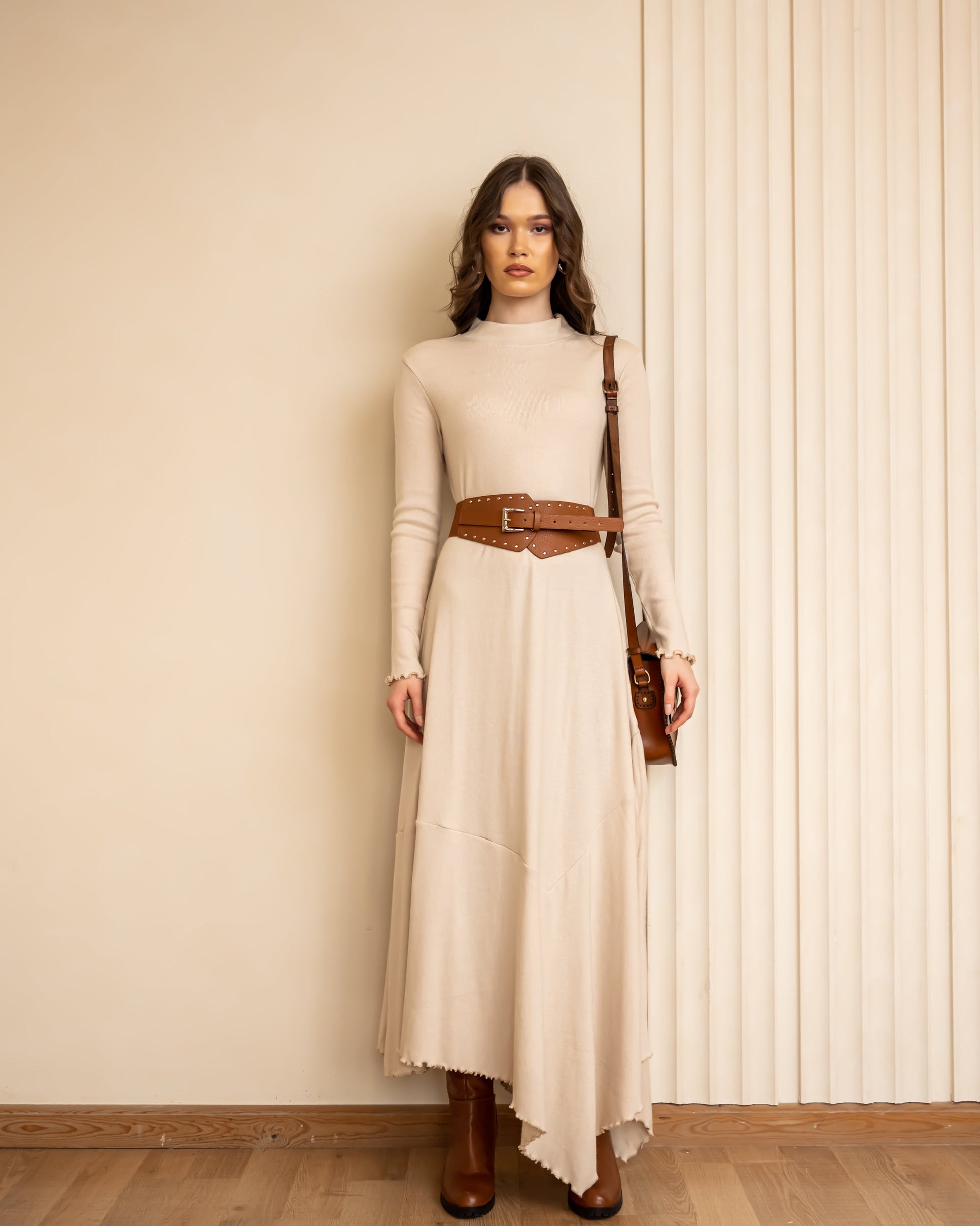 HIGH LOW RIBBED DRESS-BEIGE