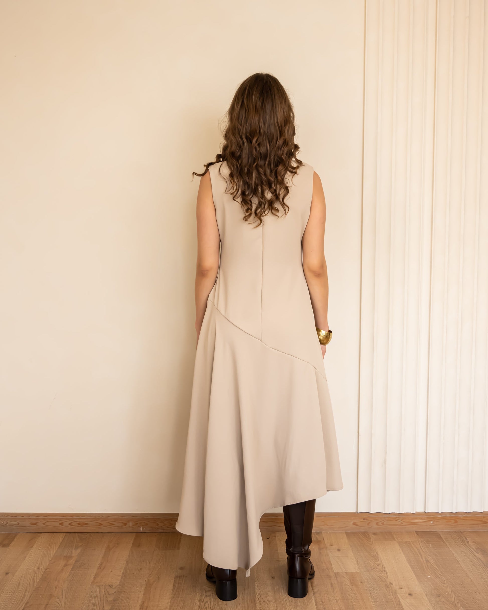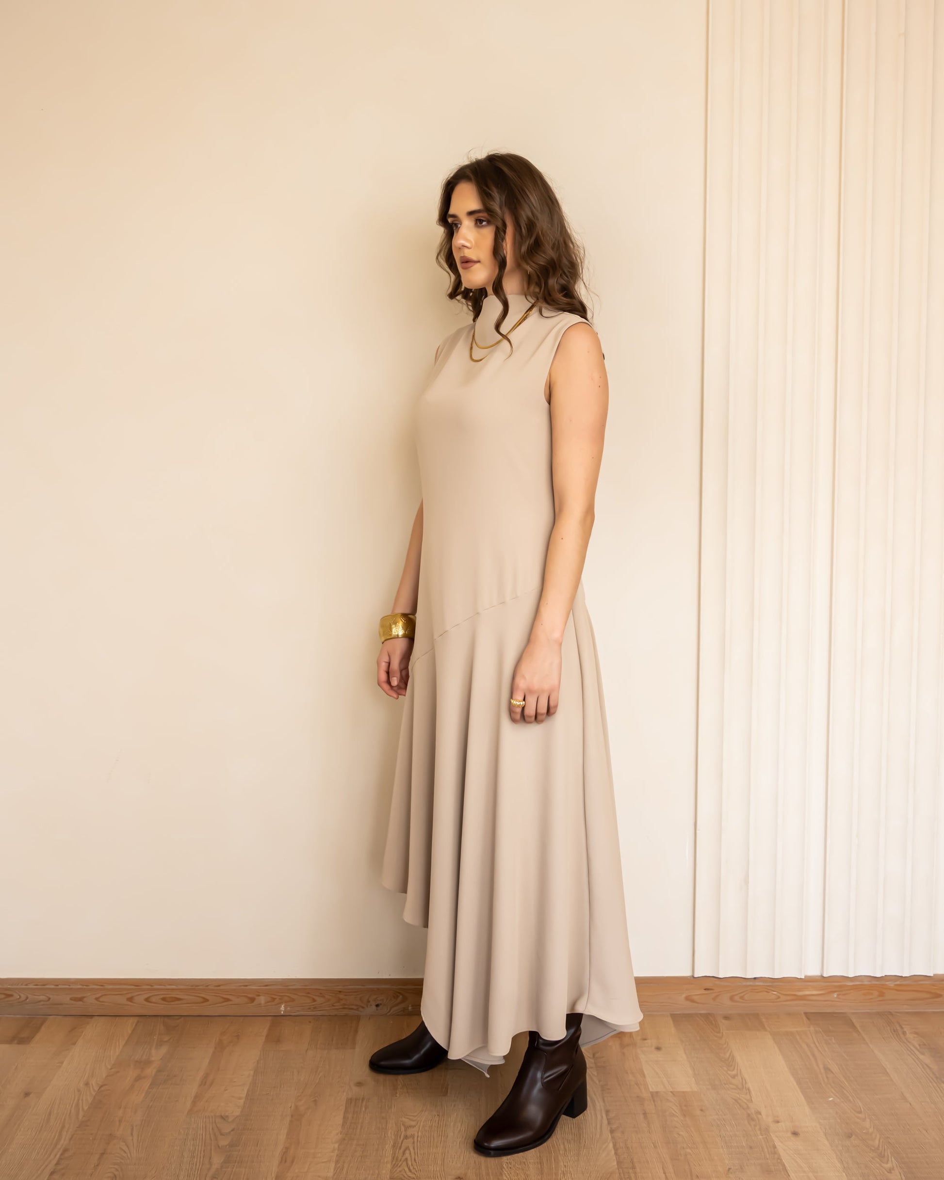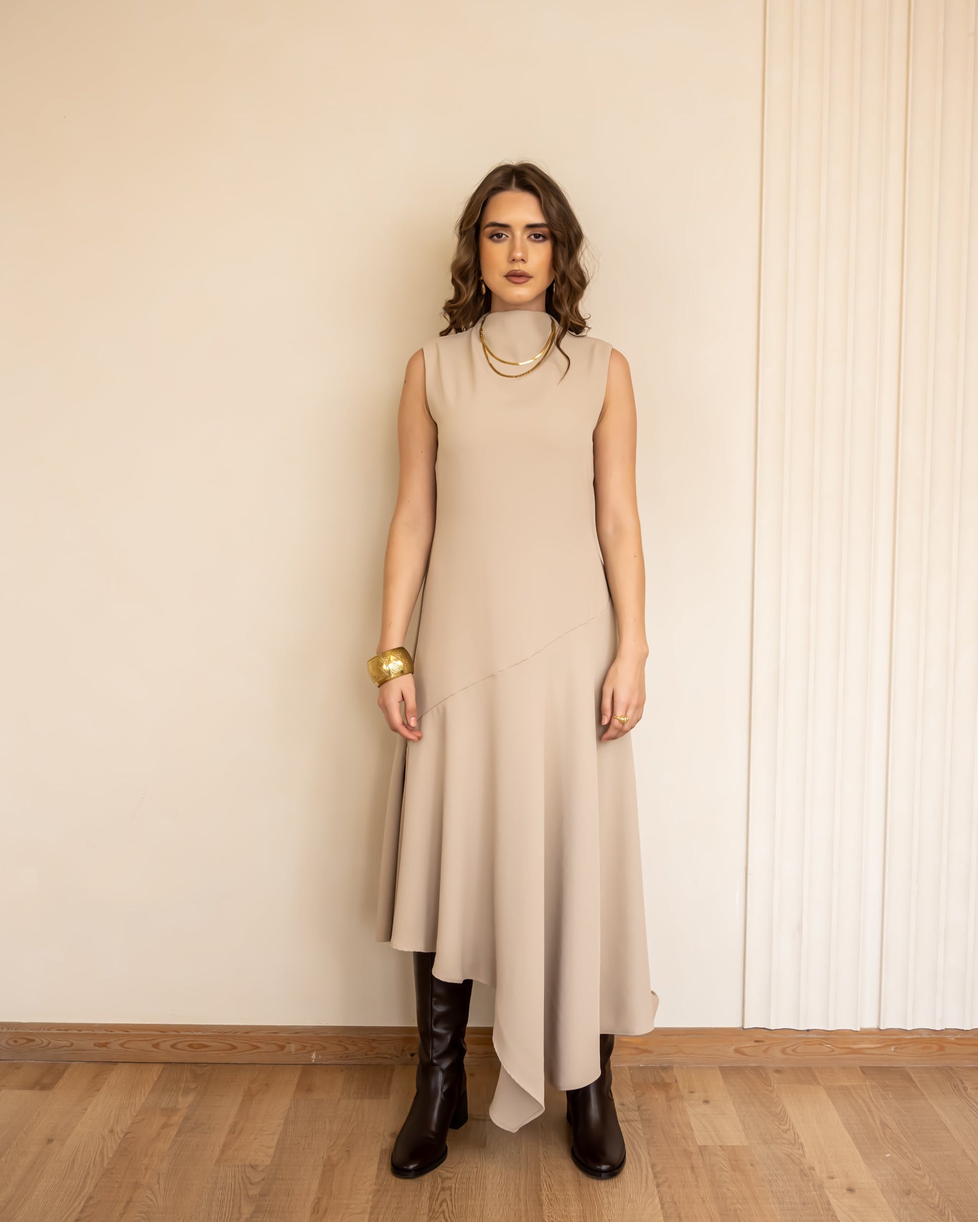 SLEEVELESS HIGH LOW DRESS-BEIGE