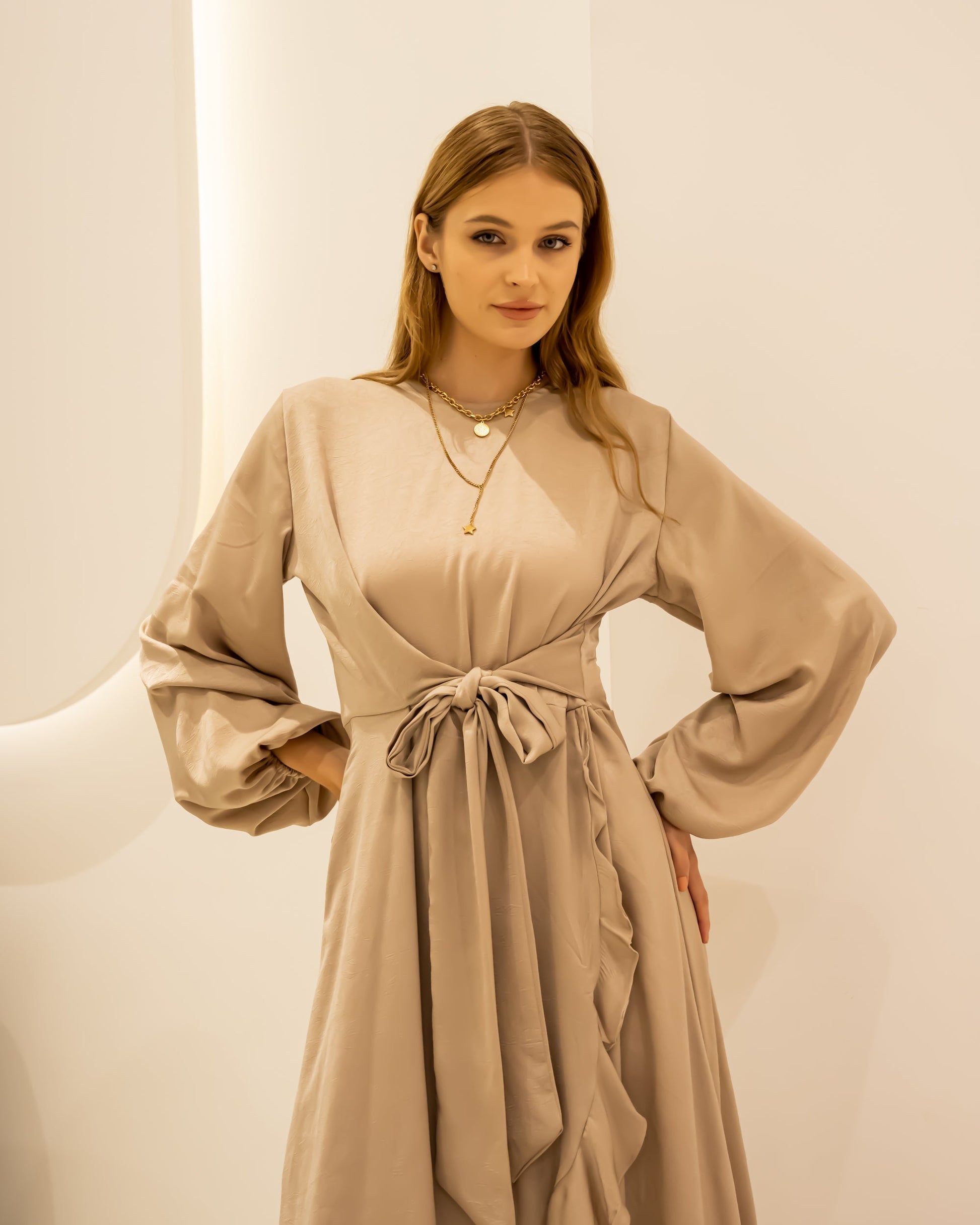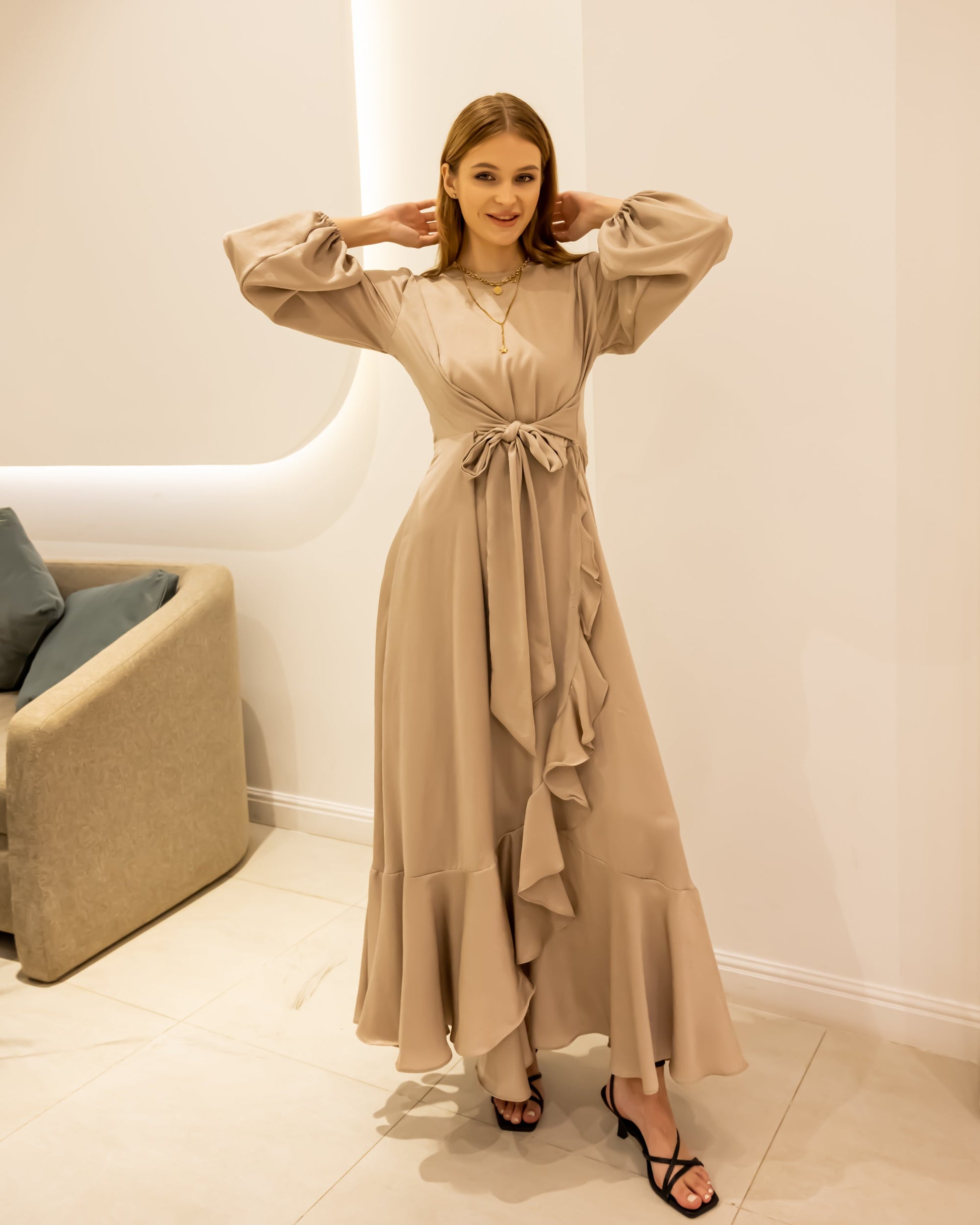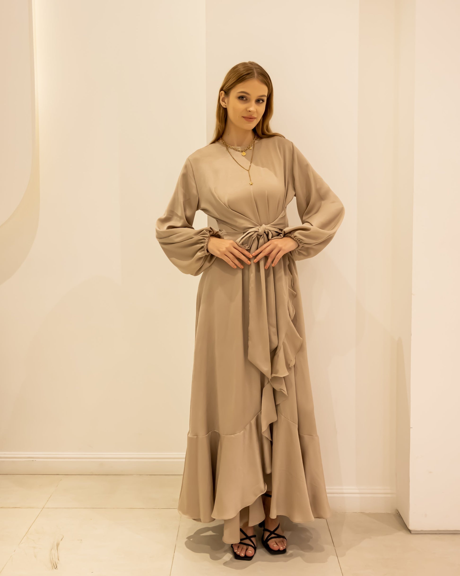 RUFFLE SATIN DRESS-DARK BEIGE