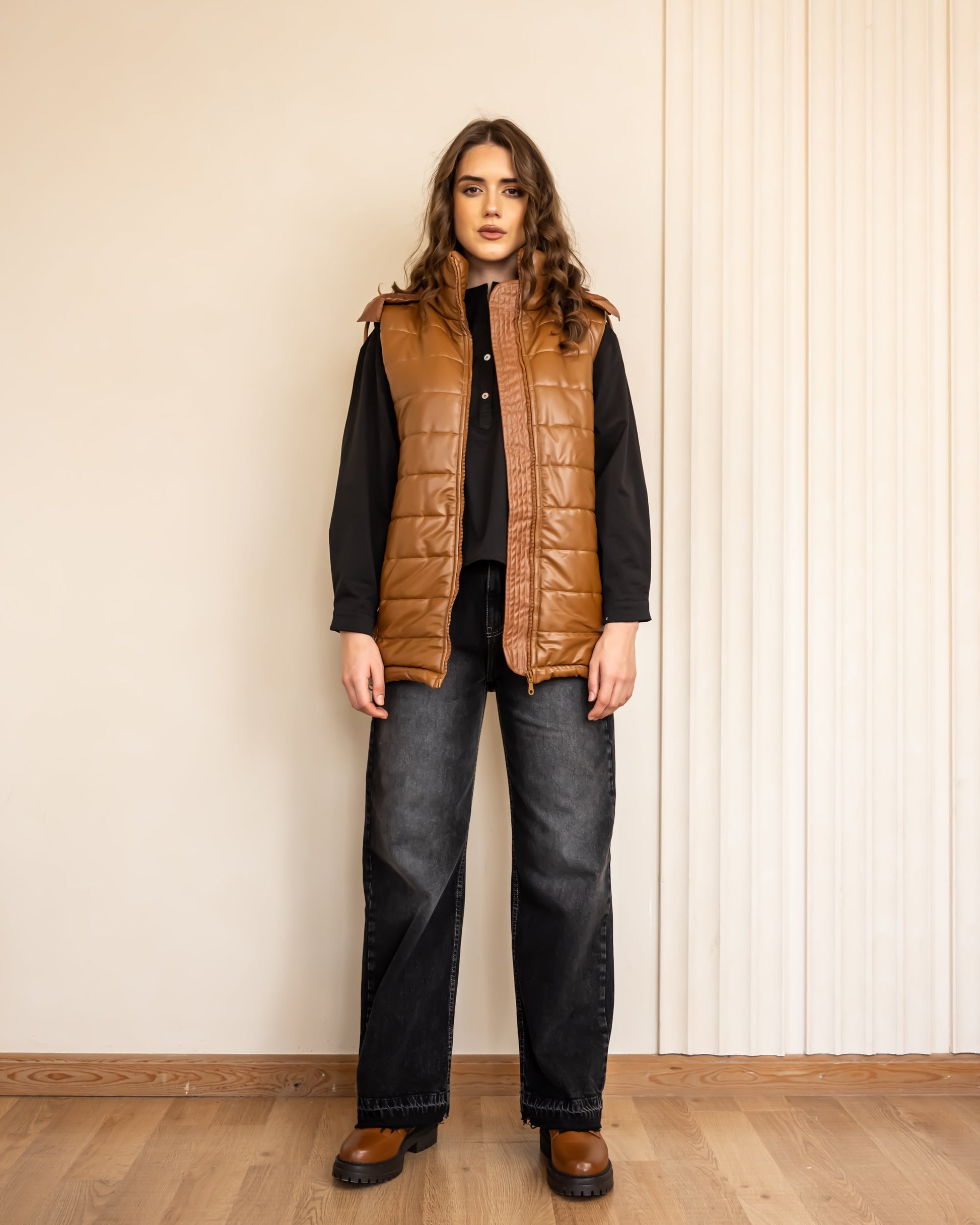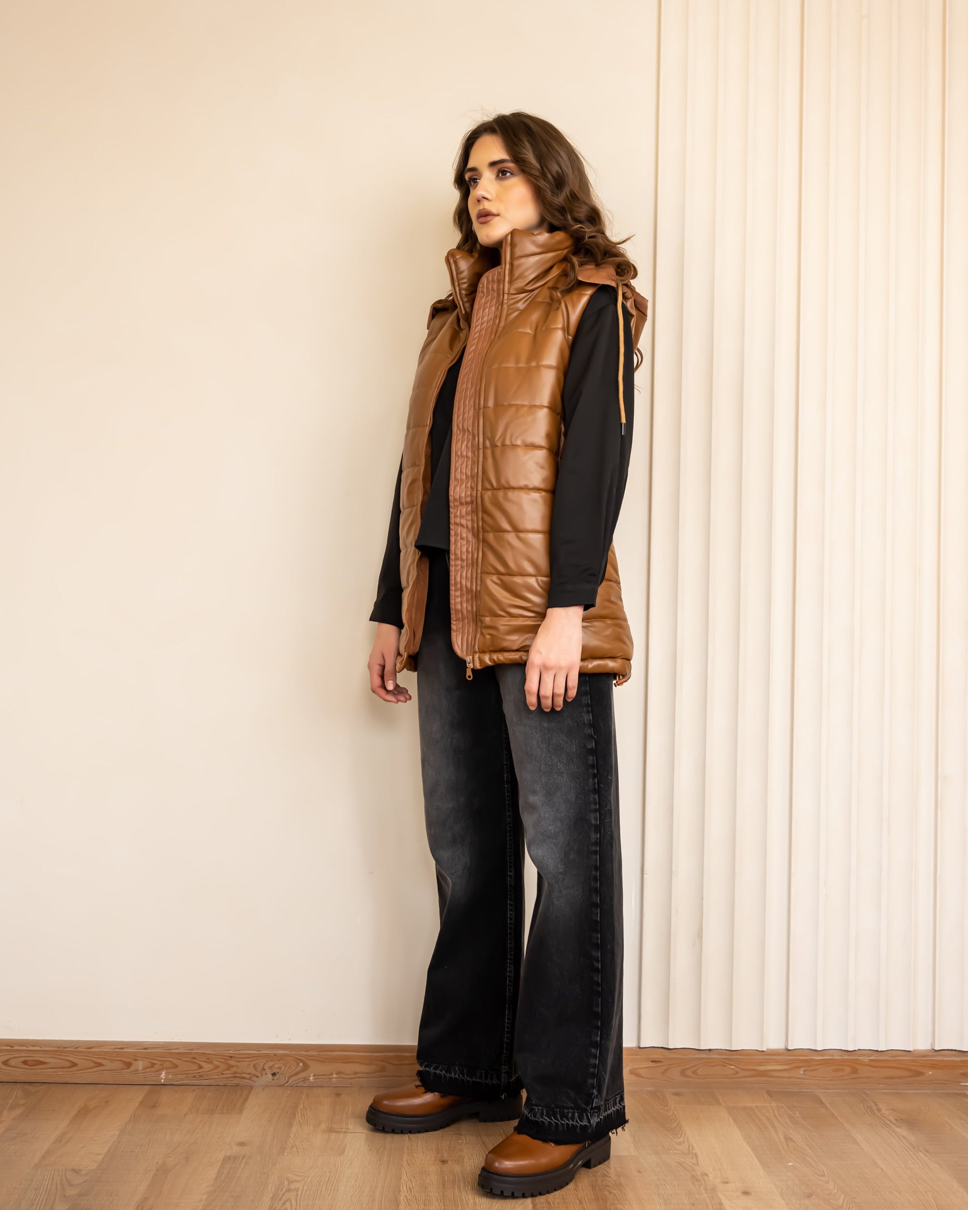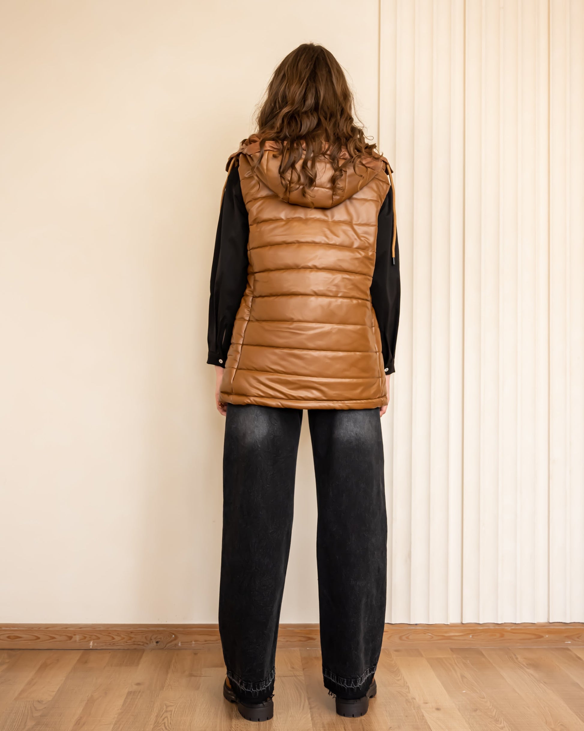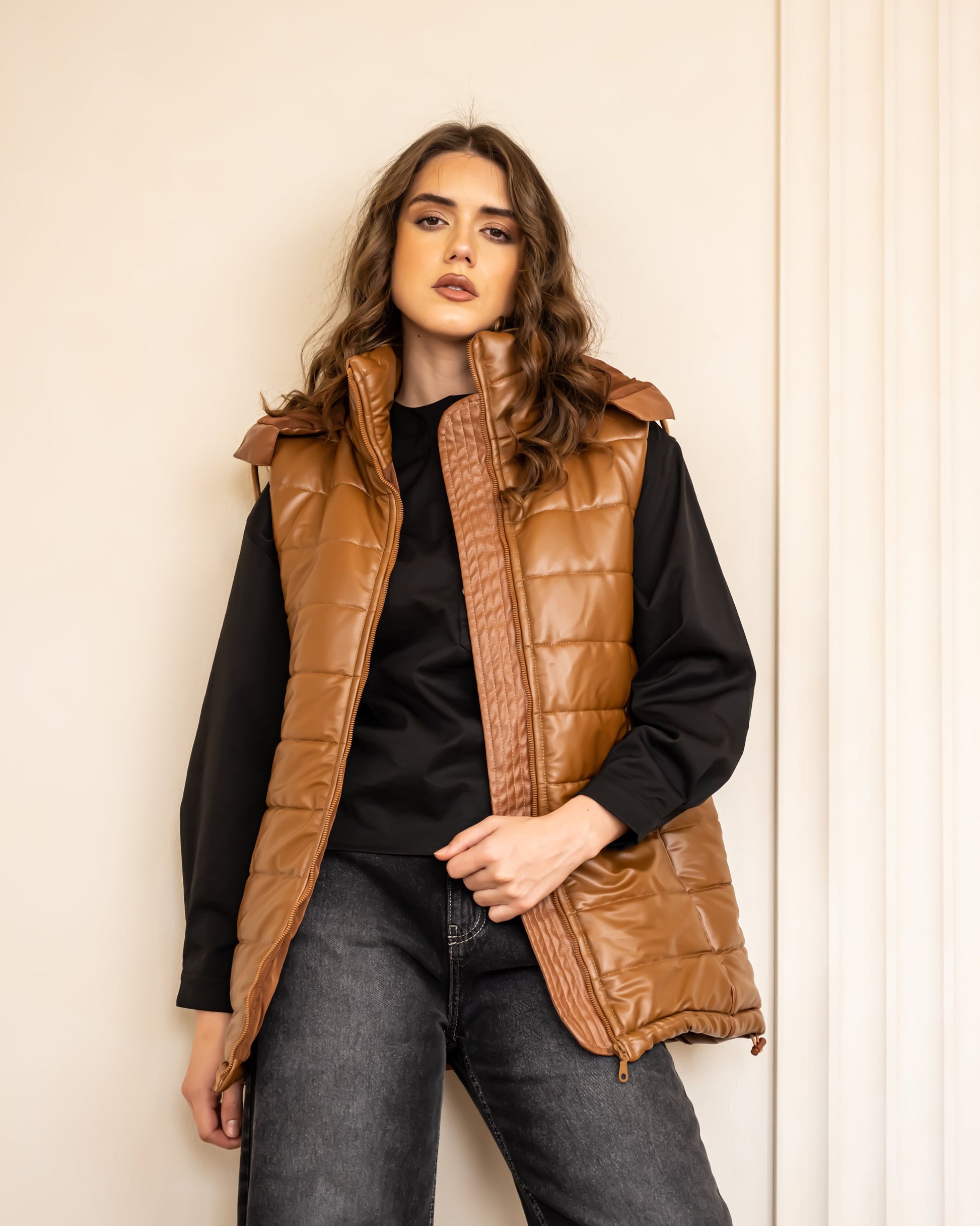 SLEEVELESS LEATHER PUFFER JACKET-HAVAN