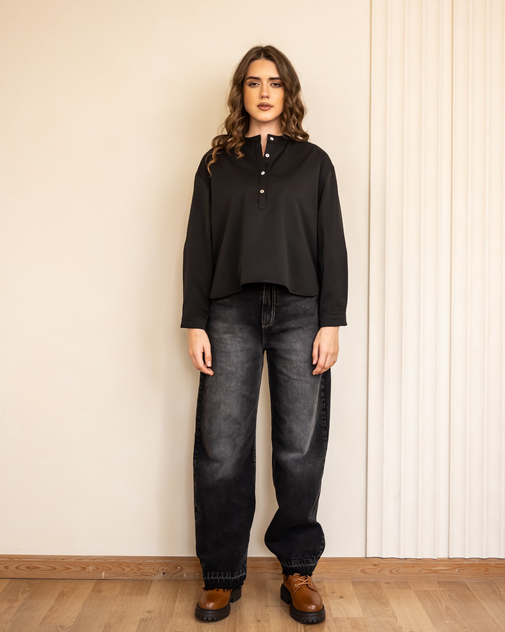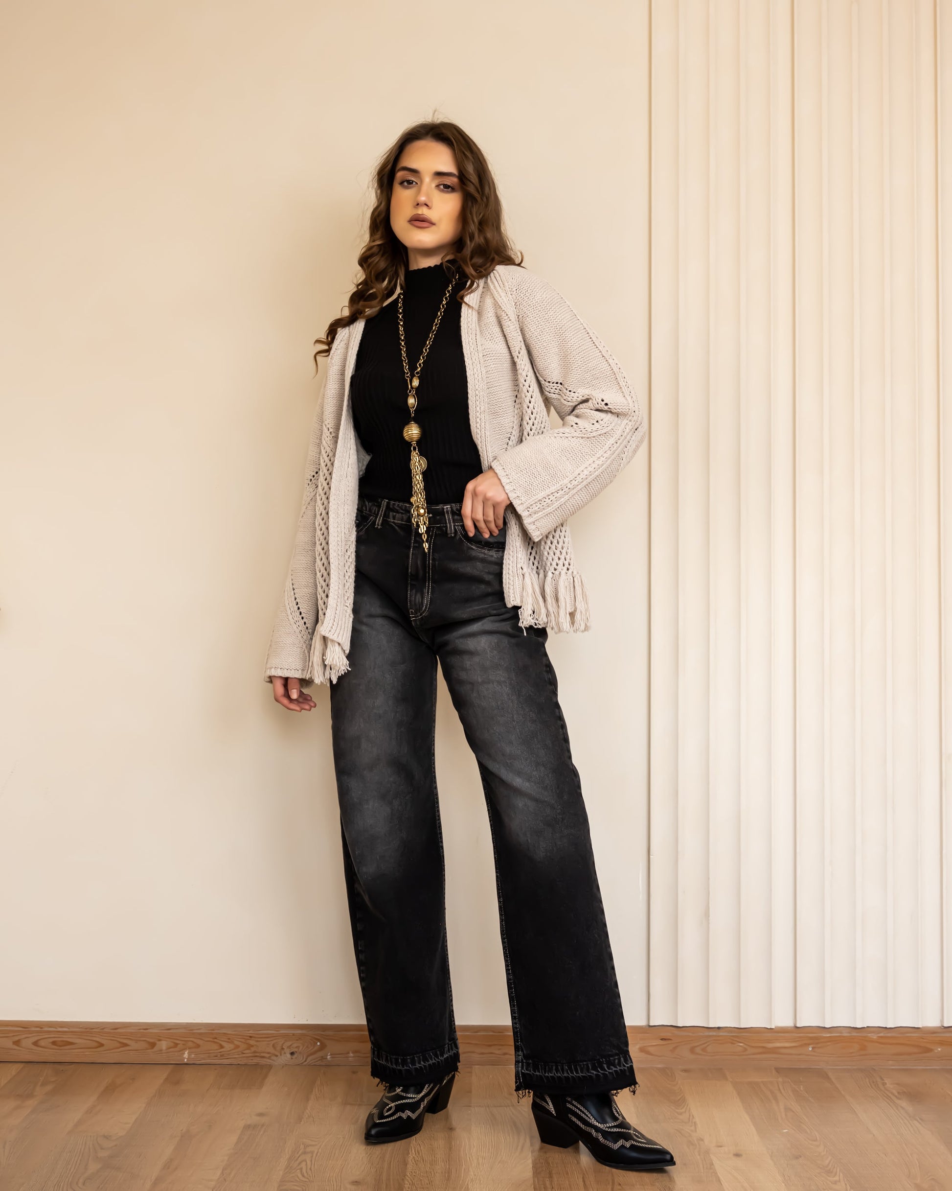 WIDE LEG FRINGE DENIM PANT-BLACK